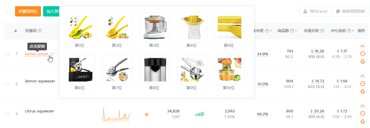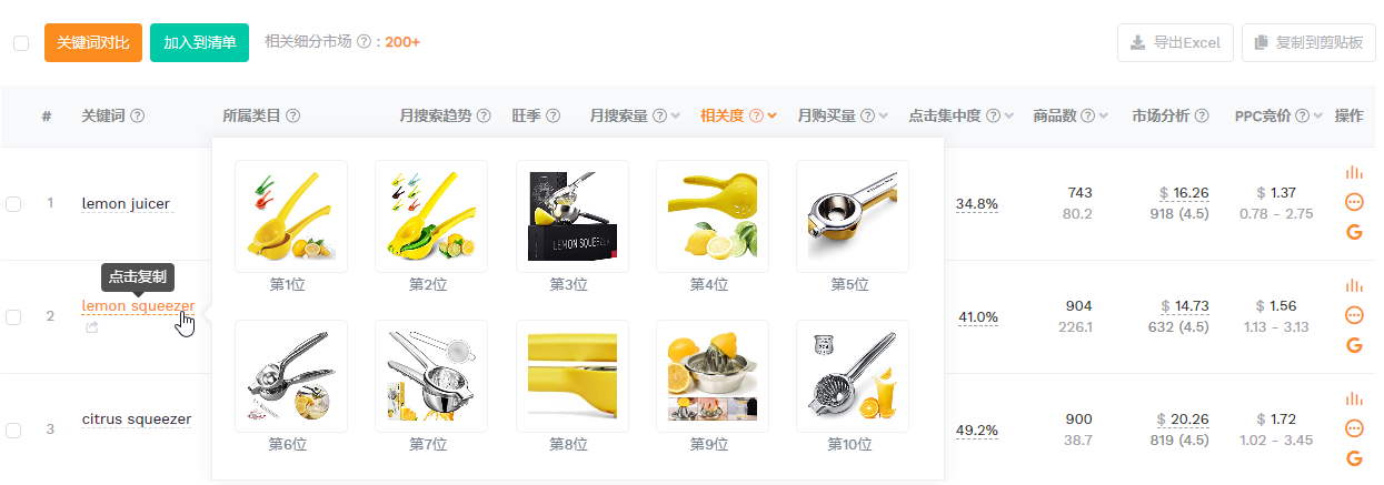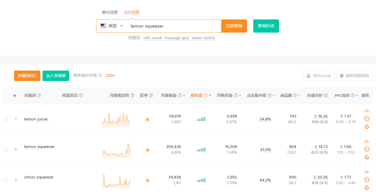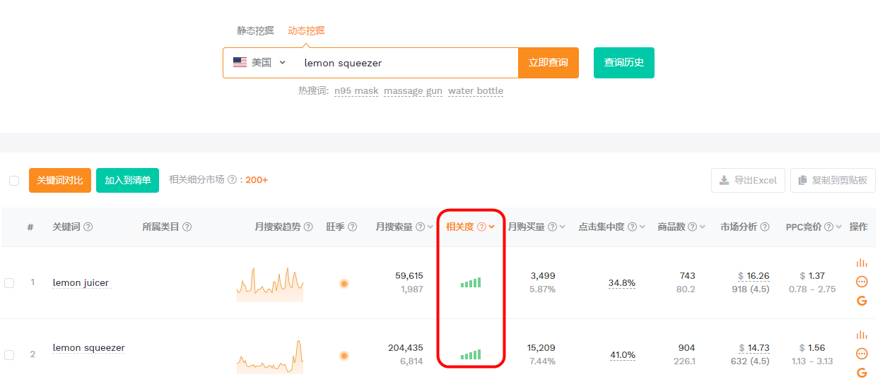 比如搜索lemon squeezer,动态挖掘的结果中的第1行是关键词lemon juicer,说明该词与lemon squeezer指向的手动榨汁机这个细分市场相关度很高。