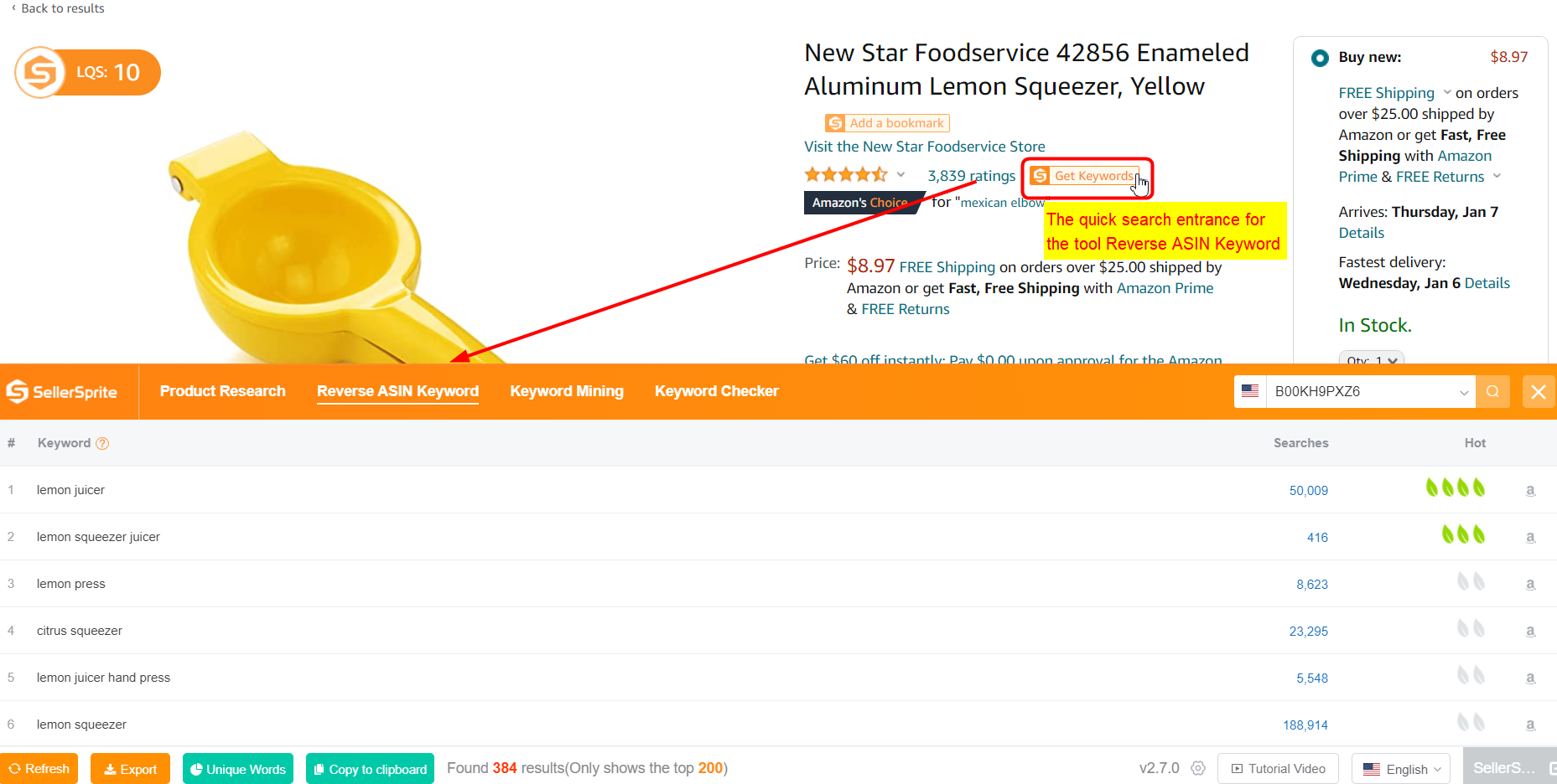 Click the button【Reverse ASIN Keyword】behind title on the Listing page will take you to the tool Reverse ASIN Keyword directly.