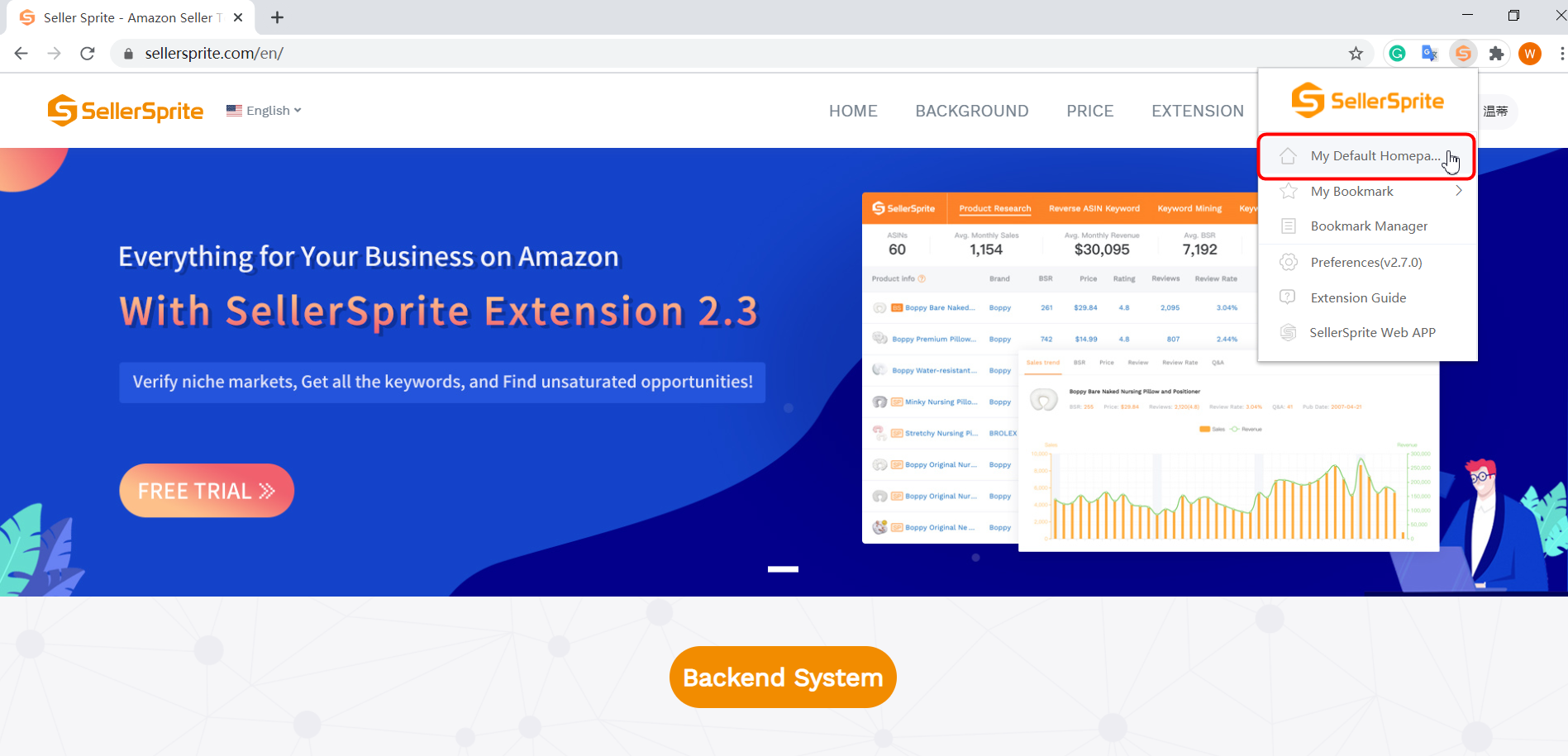 1.Click the SellerSprite’s logo in the right upper corner of the browser on any website, and choose【My Default Page】to go to the Amazon page directly.